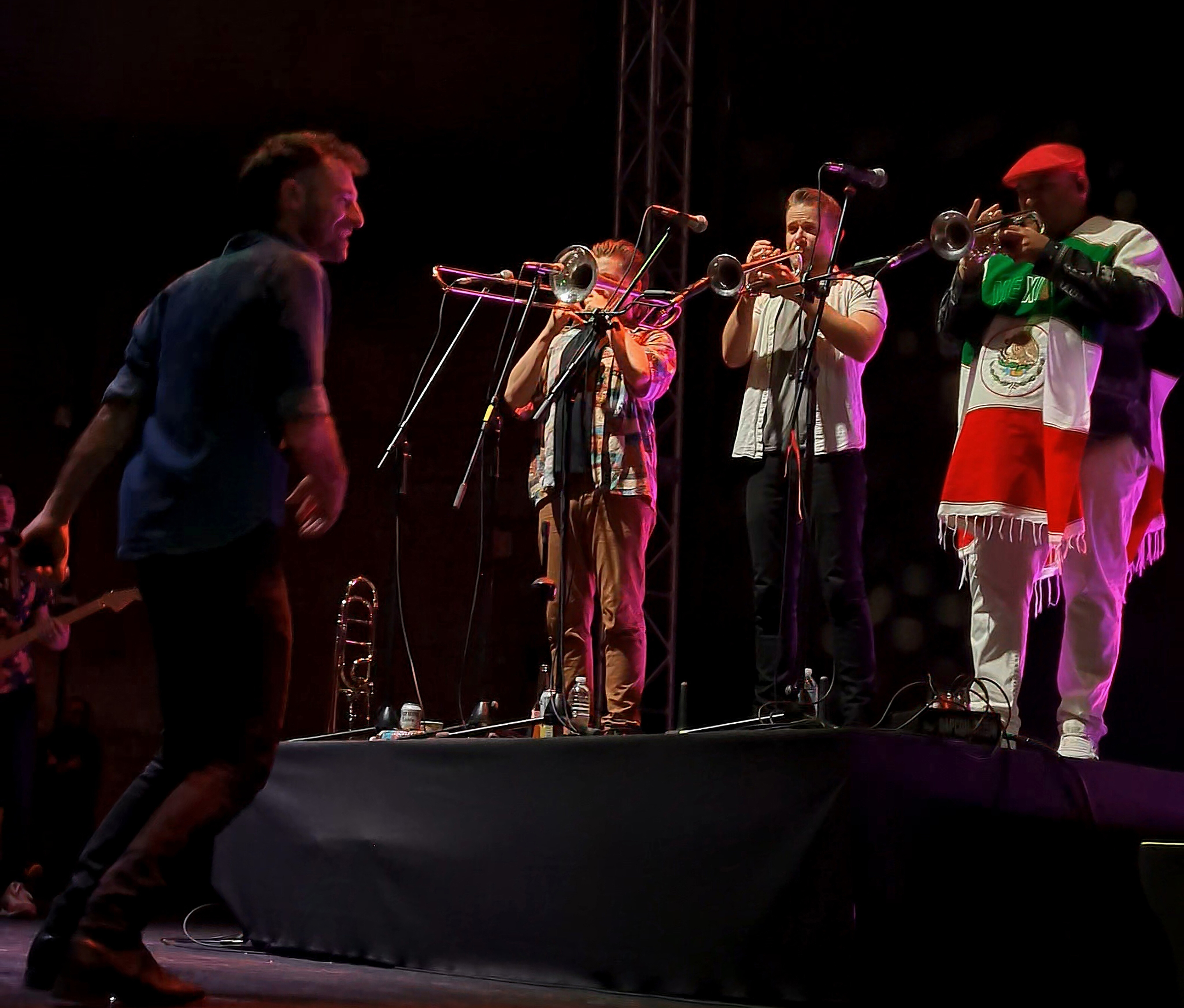 Bailando envueltos en el fuerte sonido de las trompetas y tambores, pasamos de un momento de éxtasis a envolvernos suavemente en una burbuja rítmica llena de emociones para dar paso a “Boom Boom”, que es sin duda un elemento imperdible de su más reciente álbum y que nos sirvió de combustible para transportarnos a través del tiempo hasta el 2003, abriendo nuestros sentidos para entonar “The Rythm” que con un espacio instrumental, que sin duda alguna enalteció esa fusión de jazz que es parte del ADN de la banda, y que poco a poco nos sumergió en un profundo mar de sentimientos y de nostalgia para disfrutar de “The Lost Song”, que lentamente nos llevó a un lugar aún más profundo para disfrutar de “Fishies”, canción que rápidamente nos hizo sentir como en una montaña rusa, pasando de esa melancolía previa, hasta ese sensual y provocativo ritmo que puso a bailar a muchas parejas entre el público.
